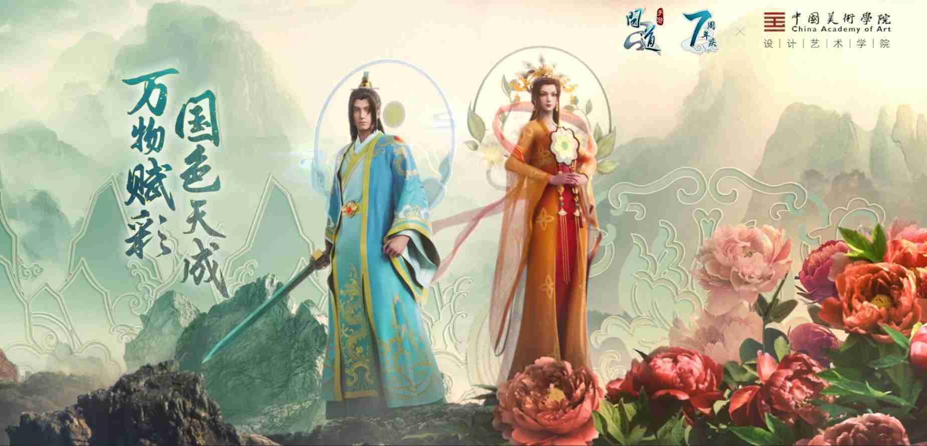 2023年4月,,《问道手游》联动中国美术学院,,在游戏中融合了中国历史上不同时期的文化元素,,,打造了“山河万象”与“凤鸣九霄”的国风时装。。。在色彩配置方面,,,,创作团队基于对游戏角色特性的分析提取相应的文化内涵,,从每一种色彩的色相、、、指代事物和情感出发对应角色属性,,,选定服装的色彩搭配。。。。在纹样设计方面,,创作团队结合游戏角色自身特殊的造型比例和形态,,,在实际的纹样设计中进行了游戏语境下的活化演绎。。。。男性角色集中使用了如蟒纹、、、、海水江崖纹、、、、如意纹和云气纹等传统纹样元素,,,女性角色则吸纳了凤凰纹、、、牡丹纹、、、、卷草缠枝纹等元素,,组成以“双凤牡丹纹样”“缠枝牡丹纹”“金玉凤冠头饰”为主要纹样的游戏角色装饰图案系统。。